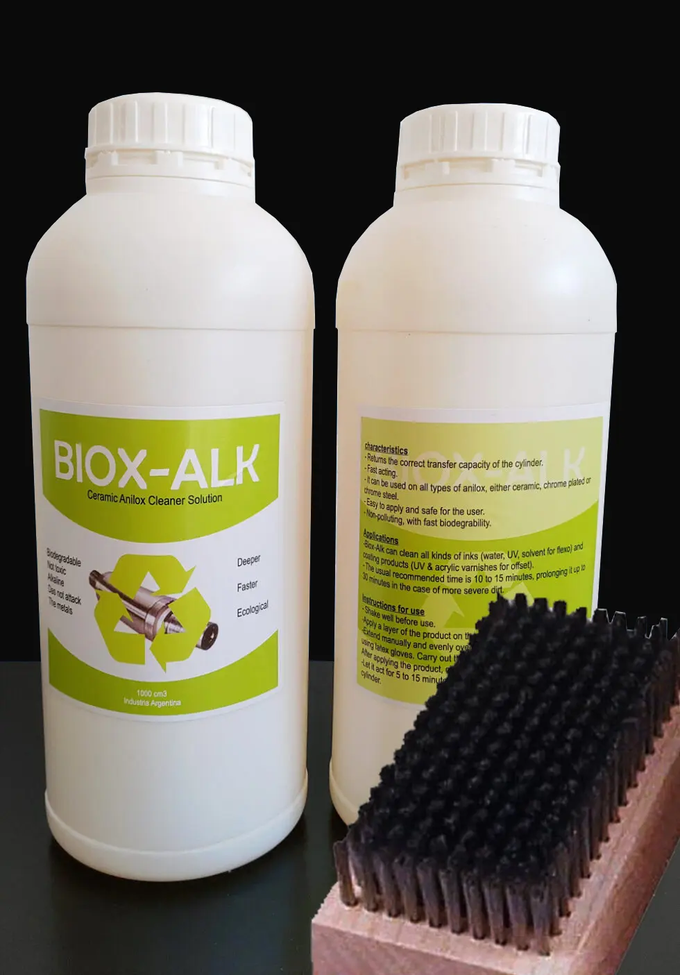 El limpiador de anilox Biox-Alk por su formulación exclusiva penetra en las celdas del anilox removiendo la tinta de una manera rapida y eficiente. No contiene acido ni sustancias toxicas por lo que es biodegradable y se remueve con agua.